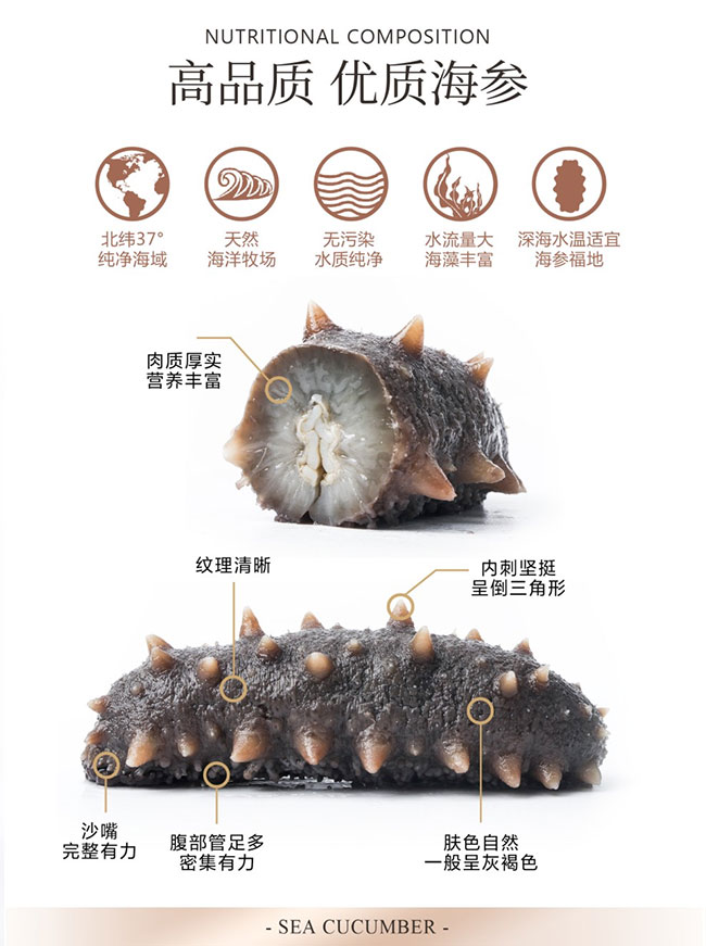 海參屬于無脊椎動物、棘皮動物門、海參綱。我國海參分布在溫帶區(qū)和熱帶區(qū),溫帶區(qū)主要在黃渤海域,主要經(jīng)濟品種是刺參,也是我國最為知名的海參種類,熱帶區(qū)主要在兩廣和海南沿海,主要經(jīng)濟品種有梅花參等。其中西沙群島、南沙群島和海南島是我國熱帶海參的主要產(chǎn)地。海參在各類山珍海味中位尊“八珍”,還具多種中醫(yī)特指的補益養(yǎng)生功能。近半個世紀(jì)以來,國內(nèi)外學(xué)者對40多種海參化學(xué)成分的研究表明海參體內(nèi)不但富含氨基酸、維生素和化學(xué)元素等人體所需的50多種營養(yǎng)成分,還含有多種生物活性物質(zhì)如酸性粘多糖、皂苷和膠原蛋白等,而且海參活性物質(zhì)的藥理活性十分廣泛。